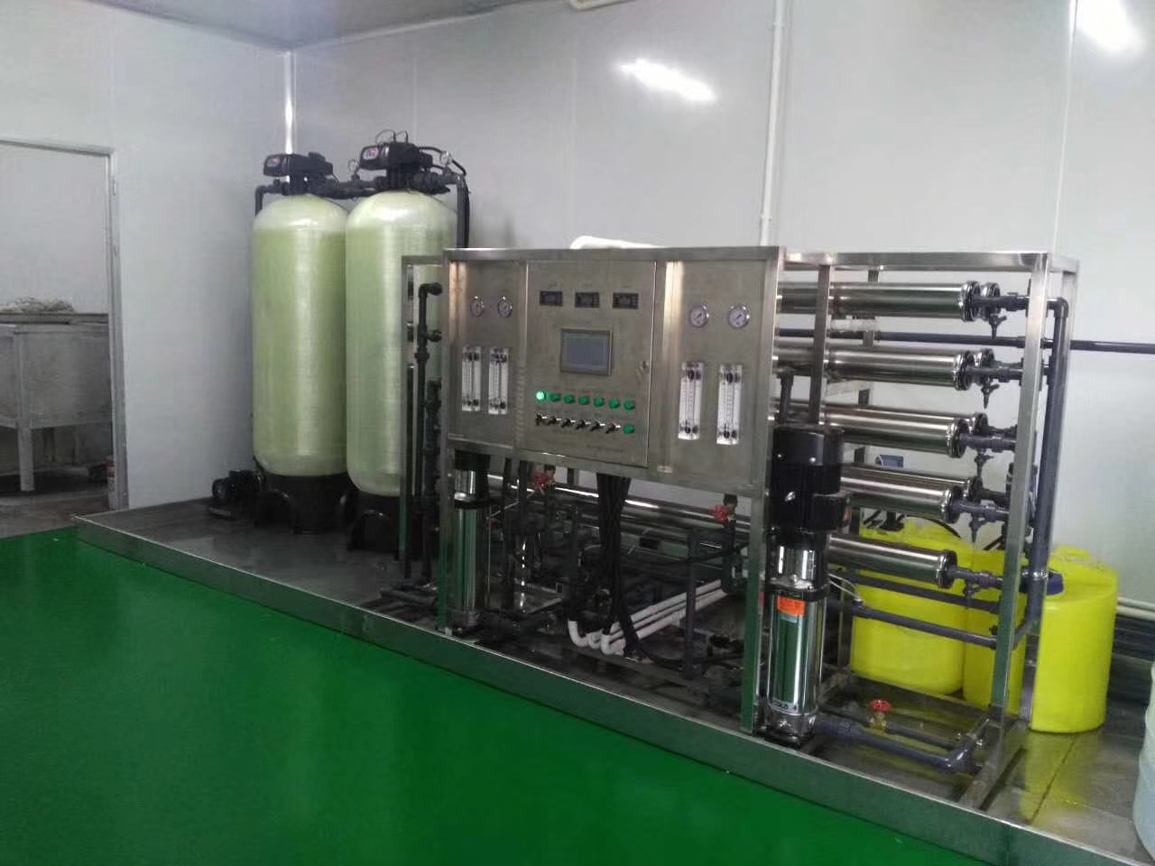 源水箱→源水增壓泵→多介質過濾器→活性碳過濾器→陽樹脂軟化器→精密過濾器→一級RO反滲透純水系統→純水水箱→增壓泵→用水點